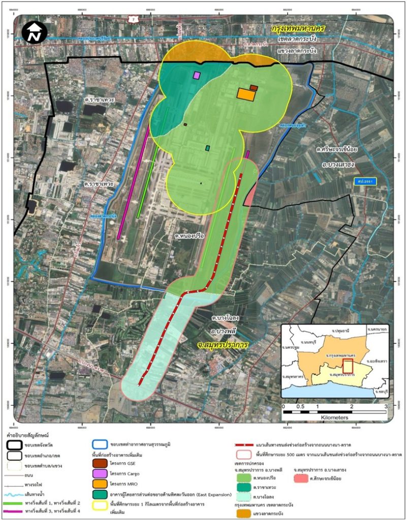การจัดทำรายงานการเปลี่ยนแปลงรายละเอียดโครงการในรายงาน EHIA โครงการก่อสร้างทางวิ่งเส้นที่ 3 และ 4 ทสภ. ซึ่งได้รับความเห็นชอบจากคณะกรรมการสิ่งแวดล้อมแห่งชาติ เมื่อวันที่ 20 กรกฎาคม พ.ศ. 2563 นั้น ได้กำหนดขอบเขตพื้นที่ศึกษาซึ่งมีระยะจากขอบเขตท่าอากาศยานไปทางทิศเหนือและใต้ด้านละ 10 กิโลเมตร และไปทางทิศตะวันตกและทิศตะวันออก ด้านละ 5 กิโลเมตร